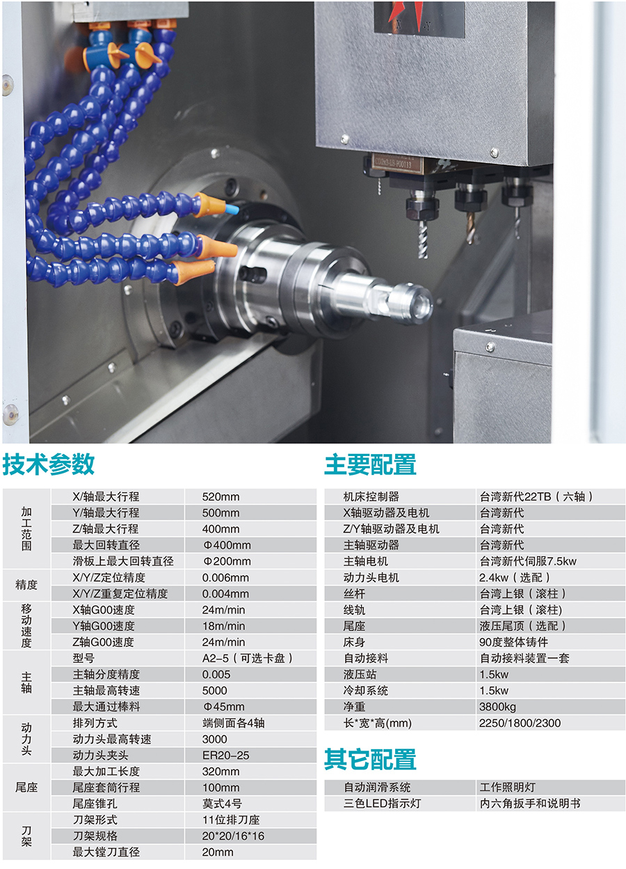 2、該床身采用平導(dǎo)軌,90度床身設(shè)計(jì),動(dòng)力頭與Y軸一體,剛性強(qiáng)。
